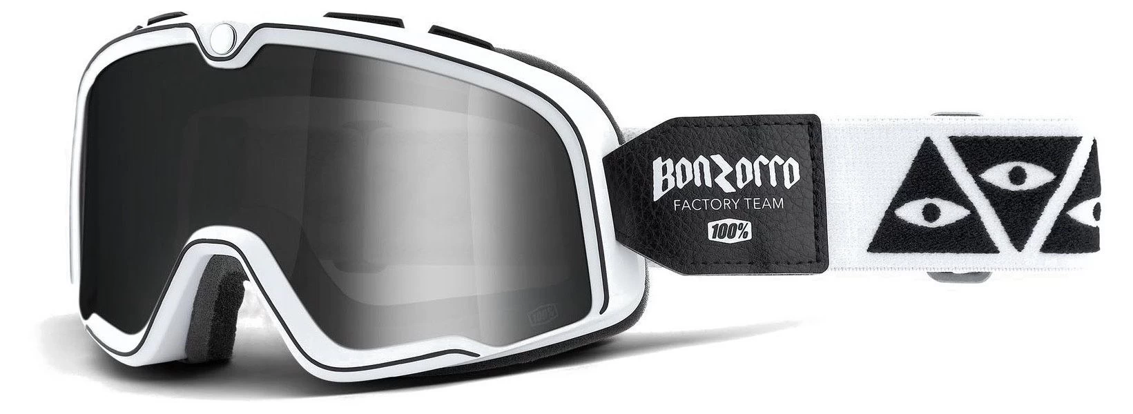 De 100percent Barstow Bonzorro komt in een opvallend design van Bonzorro op de elastische band en een wit frame. Standaard is een iridium zilveren lens gemonteerd die verwisselbaar is. Bovendien wordt standaard een heldere lens meegeleverd en een opberghoesje.