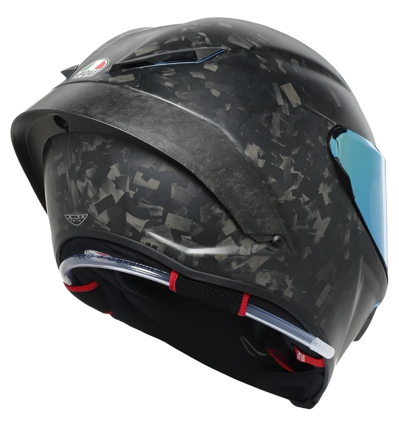 De Pista GP RR Futuro komt in speciaal forged carbon waardoor die extra sterkte biedt, maar bovenal unieke looks. De ventilatieopeningen en scharniermechanisme van het vizier zijn iridium blue gekleurd en daarbij komt standaard een Iridium Blue vizier bij de helm. De Pro spoiler is eveneens in Forged Carbon uitgevoerd.