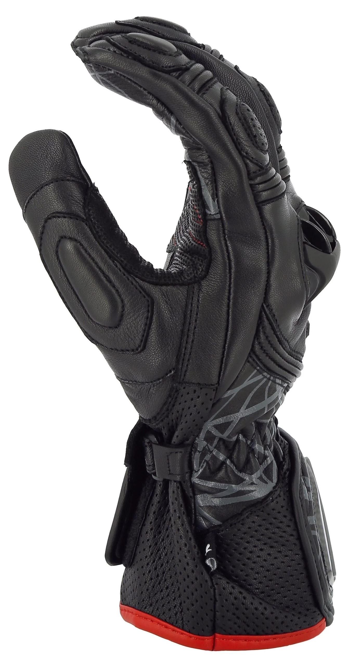 De Tiran is vervaardigd uit hoogwaardig en slijtvast geperforeerd geitenleer met een ademend karakter wat naast het bieden van een optimale bescherming ook afvoer van angstzweet mogelijk maakt. De knokkels zijn voorzien van een harde protector en op de vingers, handpalm en bovenkant van de handschoen is een extra laag foam protectie verwerkt. Ook niet onbelangrijk bij een racehandschoen is de brug tussen de pink en ringvinger wat voor een stevige verbinding van de pink zorgt. De lange manchet zorgt ervoor dat de handschoen over een motorjas heen te dragen is wat zorgt voor een goede aansluiting en bescherming rond de pols.