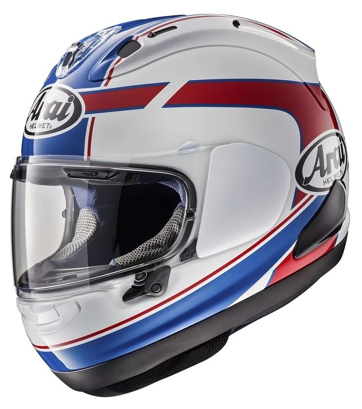 De Arai RX-7V EVO Schwantz is een replica in Pepsi-kleuren van voormalig raceicoon Kevin Schwantz die in de jaren ’80 hoge ogen gooide.